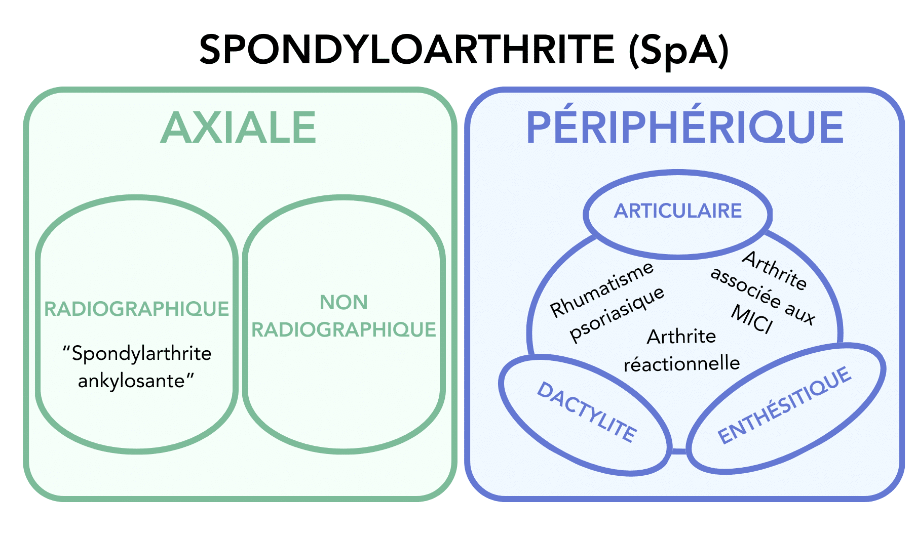Les spondyloarthrites (SpA), précédemment nommées spondylarthropathies, comportent des formes périphériques (comme le rhumatisme psoriasique) et/ou des formes axiales parfois dites ankylosantes (SA) en présence de signes radiographiques.